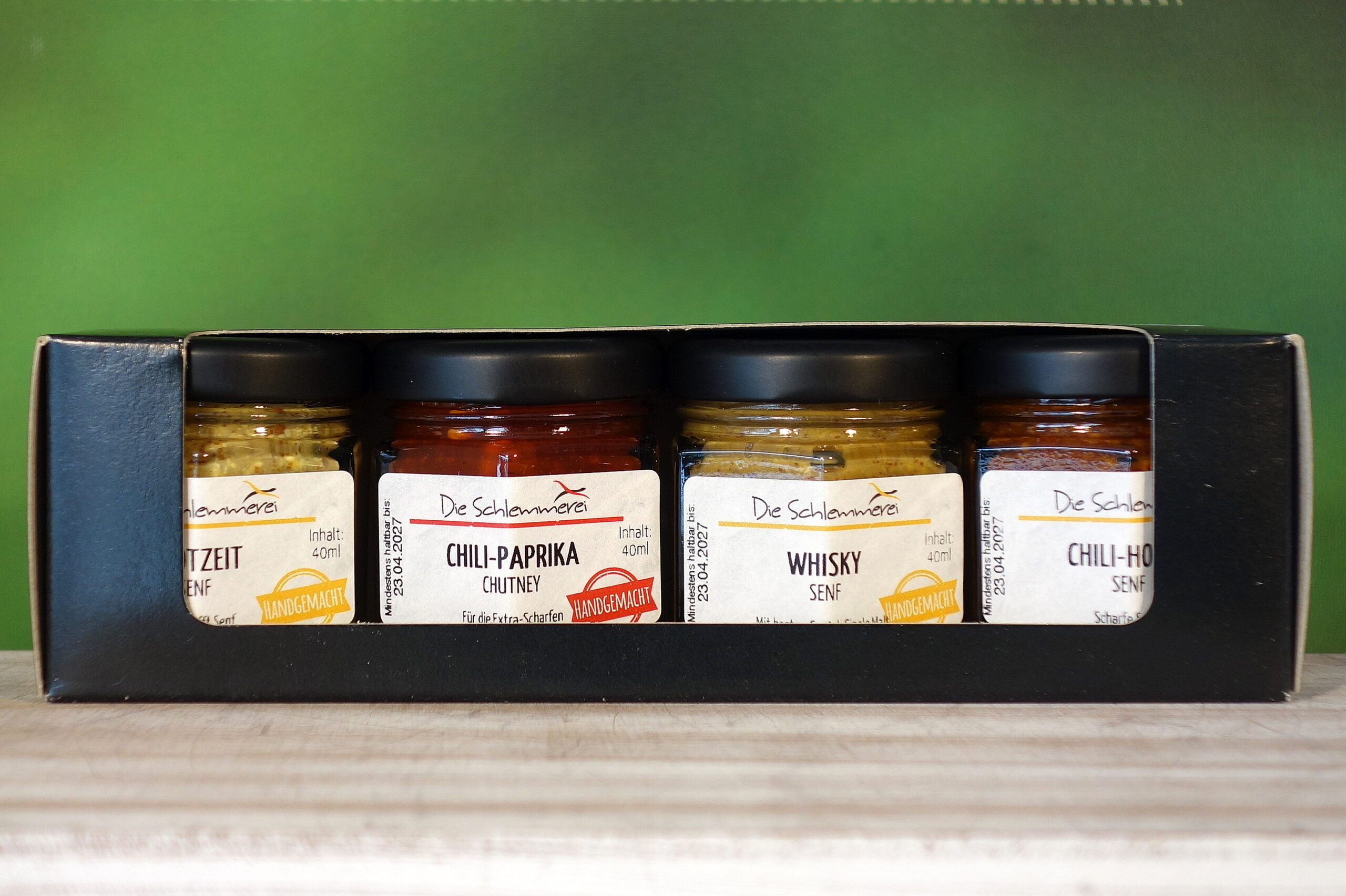 Unsere neue Zusammenstellung von vier außergewöhnlich leckeren Senfsorten in der Geschenkschachtel!