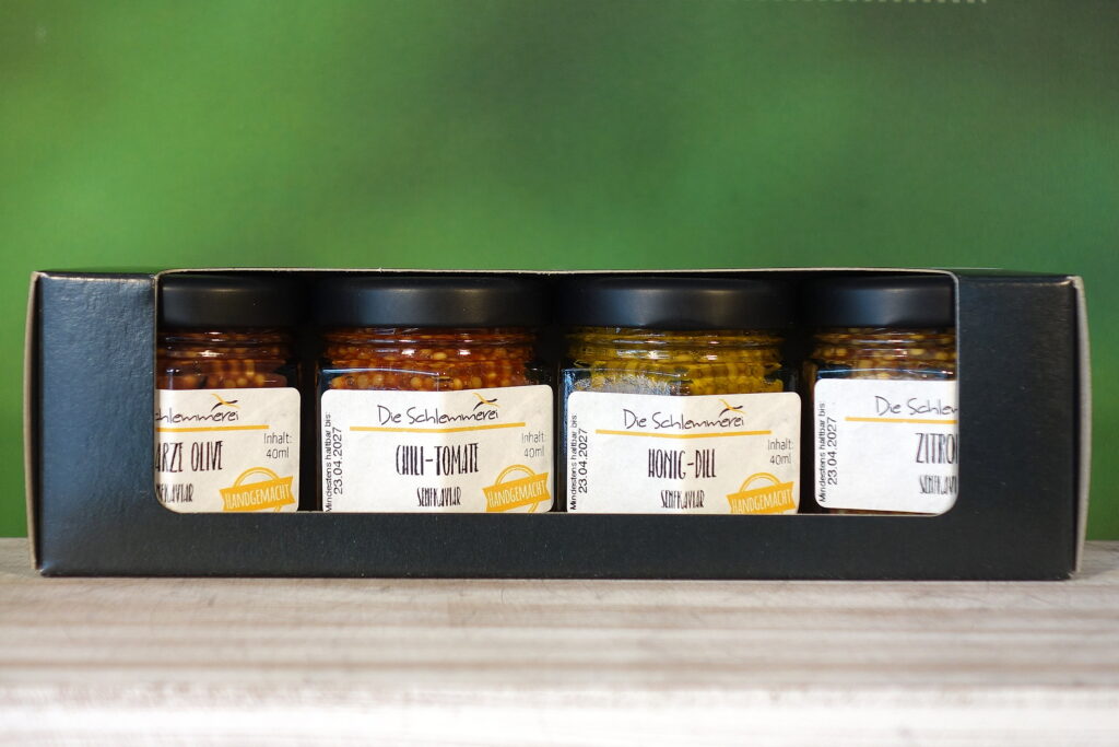 Knackig, überraschend, was für ein Genuss! Probieren Sie unsere vier Senfkaviarvarianten in dieser Box.